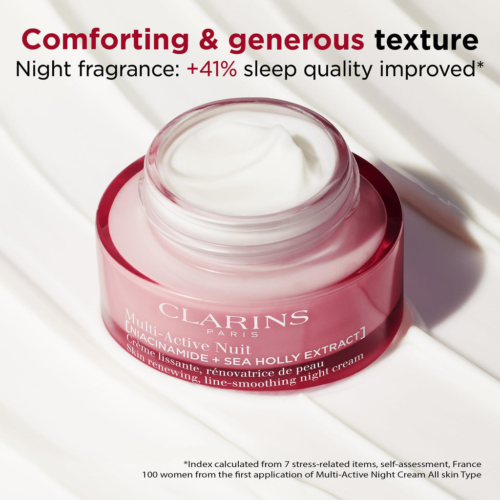 For best results, make the Clarins Multi-Active Night Cream the last step in your evening skincare routine. Its rich, velvety texture is particularly beneficial for dry skin, expertly providing moisture and ensuring your complexion is revitalized and ready for the following day. Trust in Clarins for effective, soothing skincare solutions that restore and refresh your skin.