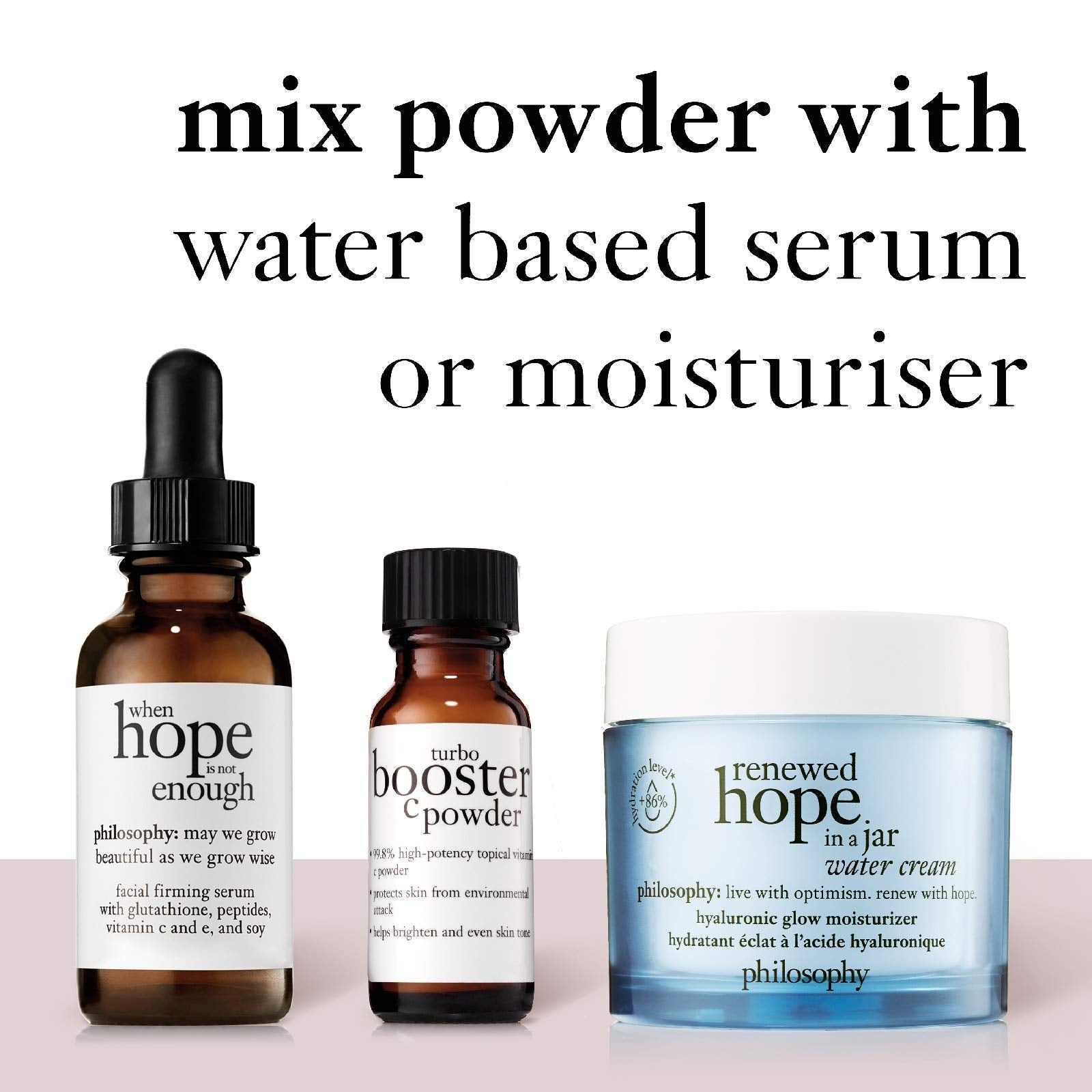 The Philosophy Turbo Booster C Powder gives you the freedom to personalize your skincare—mix it fresh each day to cater to your skin's specific needs. Whether blended with a serum or moisturizer, you can customize your skincare experience for optimal, radiant results.